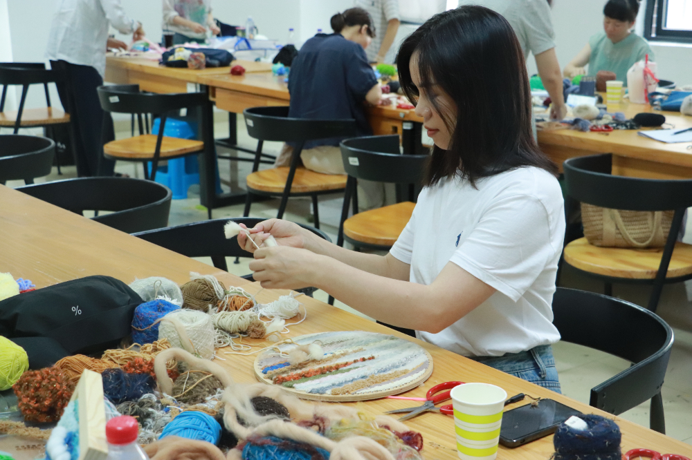 三位教师带领学员学习传统手工编织的手法,指导大家运用不同的创作材料进行实践实验,在过程中针对性辅导学员的编织手法及材料选择方法。课程最后,三位教师对学员的作品进行点评,并共同探讨日后如何将其与中小学美术课程相结合运用。